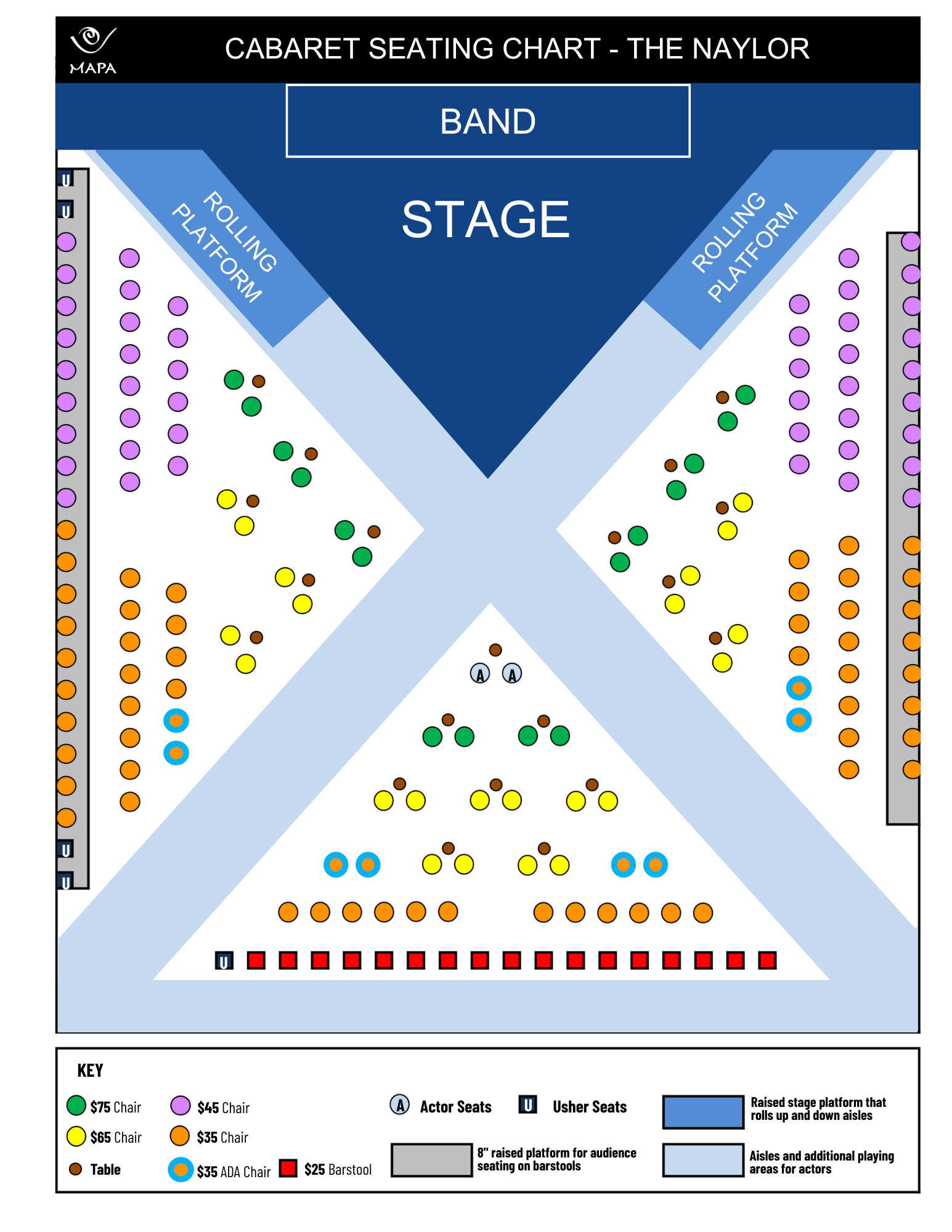 We heard from some audience members on opening weekend that the barstools were challenging for some folks to navigate, so we have replaced most barstools with regular cabaret seats. (The only row of barstools remaining are the $25 seats.) All chairs and barstools are cushioned on the seat. Some audience members might enjoy bringing a thin cushion for their backs, but we will also have a limited number of back cushions available at the theatre. All chairs and barstools are commercial-grade with a weight capacity of 770 pounds. ***Please note that seating for Cabaret does not incorporate the chairs in our donor naming opportunity due to a delay in the chairs arriving on-island.***