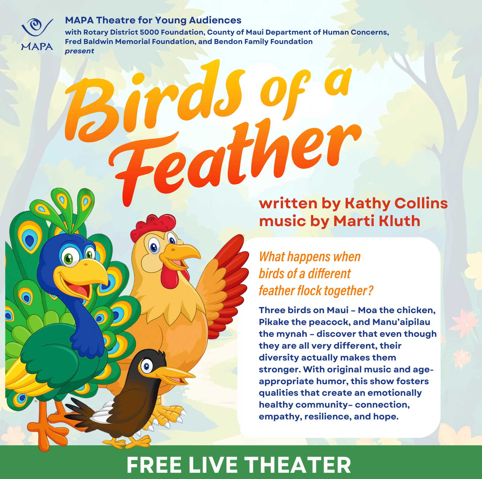 Birds of a Feather has been seen by thousands of Maui preschoolers and elementary school students this spring. Please join us for a free community performance of this hilarious 40- minute musical in the Naylor Theatre! Appropriate for all ages.